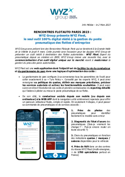 WYZ Group sera présent lors des Rencontres Flotauto Paris qui se tiendront à la Grande Halle de la Villette le jeudi 9 mars. Cette journée sera l’occasion pour les équipes WYZ Group de présenter un outil inédit à destination des flottes automobiles : WYZ Fleet. Expert du pneumatique depuis sa création en 2009, WYZ Group innove une nouvelle fois, avec la commercialisation d’un outil digital unique sur le marché visant à moderniser la gestion du pneu des parcs automobiles.