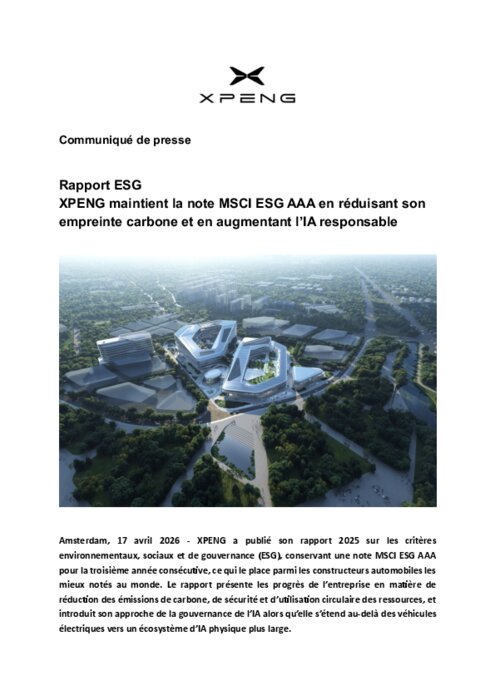 XPENG a publié son rapport 2025 sur les critères environnementaux, sociaux et de gouvernance (ESG), conservant une note MSCI ESG AAA pour la troisième année consécutive, ce qui le place parmi les constructeurs automobiles les mieux notés au monde. Le rapport présente les progrès de l’entreprise en matière de réduction des émissions de carbone, de sécurité et d’utilisation circulaire des ressources, et introduit son approche de la gouvernance de l’IA alors qu’elle s’étend au-delà des véhicules électriques vers un écosystème d’IA physique plus large.