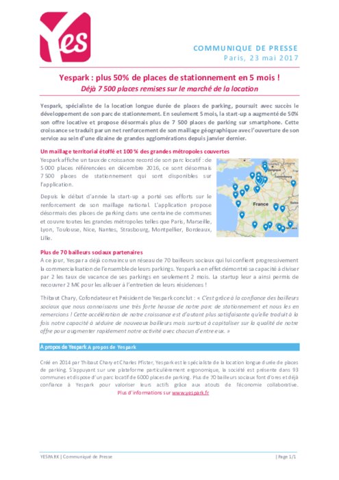 Yespark, spécialiste de la location longue durée de places de parking, poursuit avec succès le développement de son parc de stationnement. En seulement 5 mois, la start-up a augmenté de 50% son offre locative et propose désormais plus de 7 500 places de parking sur smartphone. Cette croissance se traduit par un net renforcement de son maillage géographique avec l'ouverture de son service au sein d'une dizaine de grandes agglomérations depuis janvier dernier.