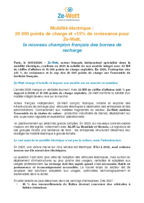Ze-Watt, acteur français indépendant spécialisé dans la mobilité électrique, confirme en 2025 la solidité de son modèle intégré avec 22 M€ de chiffre d’affaires et 16 000 points de charge exploités. En 2026, l’entreprise vise +15 % de croissance et le cap des 20 000 points de charge sur l’ensemble du territoire français.