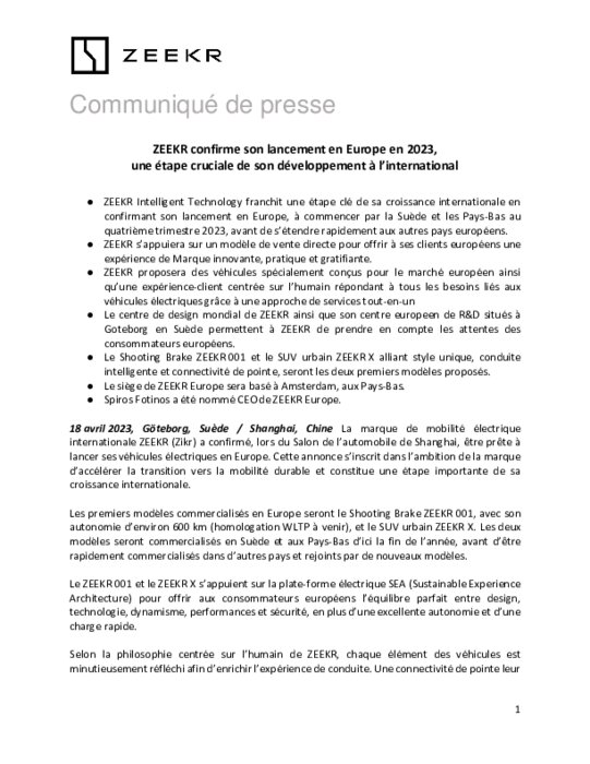 ZEEKR Intelligent Technology franchit une étape clé de sa croissance internationale en confirmant son lancement en Europe, à commencer par la Suède et les Pays-Bas au quatrième trimestre 2023, avant de s’étendre rapidement aux autres pays européens. ZEEKR s’appuiera sur un modèle de vente directe pour offrir à ses clients européens une expérience de Marque innovante, pratique et gratifiante.