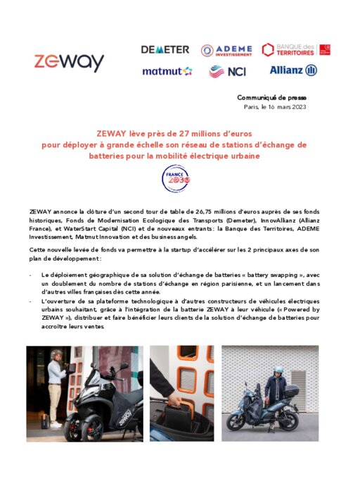 ZEWAY annonce la clôture d’un second tour de table de 26,75 millions d’euros auprès de ses fonds historiques, Fonds de Modernisation Ecologique des Transports (Demeter), InnovAllianz (Allianz France), et WaterStart Capital (NCI) et de nouveaux entrants : la Banque des Territoires, ADEME Investissement, Matmut Innovation et des business angels.