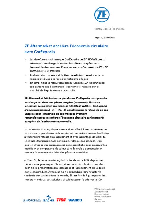 ZF Aftermarket fait évoluer sa plateforme CorExpedia pour prendre en charge le retour des pièces usagées (carcasses). Après un lancement réussi pour ses marques Sachs et Wabco, CorExpedia s’ouvre aux pièces ZF et TRW. ZF simplifie ainsi le retour de pièces usagées pour l’ensemble de ses marques Premium remanufacturées et renforce l’économie circulaire sur le marché européen de l’après-vente automobile.