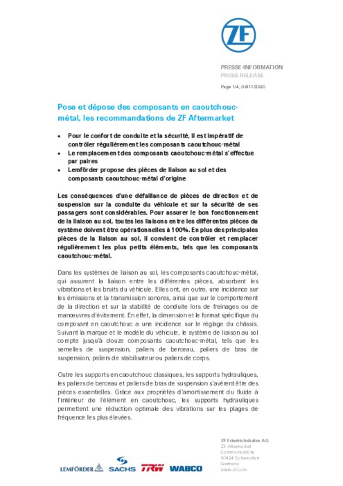 Les conséquences d'une défaillance de pièces de direction et de suspension sur la conduite du véhicule et sur la sécurité de ses passagers sont considérables. Pour assurer le bon fonctionnement de la liaison au sol, toutes les liaisons entre les différentes pièces du système doivent être opérationnelles à 100%. En plus des principales pièces de la liaison au sol, il convient de contrôler et remplacer régulièrement les plus petits éléments, tels que les composants caoutchouc-métal...