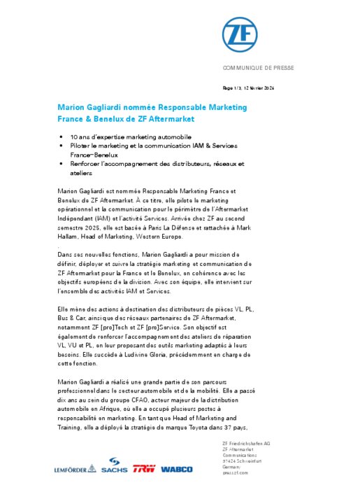 Marion Gagliardi est nommée Responsable Marketing France et Benelux de ZF Aftermarket. À ce titre, elle pilote le marketing opérationnel et la communication pour le périmètre de l’Aftermarket Indépendant (IAM) et l’activité Services. Arrivée chez ZF au second semestre 2025, elle est basée à Paris La Défense et rattachée à Mark Hallam, Head of Marketing, Western Europe.