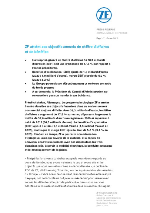 Le groupe technologique ZF a atteint l'année dernière ses objectifs financiers dans un environnement commercial toujours difficile. Avec 38,3 milliards d'euros, le chiffre d'affaires a augmenté de 17,5 % sur un an, dépassant largement le chiffre de 32,6 milliards d'euros enregistré en 2020 et supérieur à celui de 2019 (36,5 milliards d'euros). Le bénéfice d’exploitation (EBIT) ajusté a atteint 1,9 milliard d'euros (1,0 milliard d'euros en 2020), tandis que la marge EBIT ajustée était de 5,0 %.