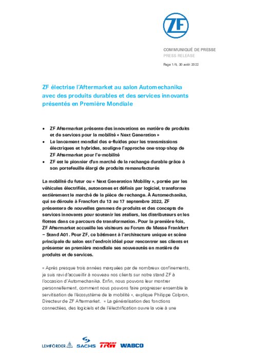 La mobilité du futur ou « Next Generation Mobility », portée par les véhicules électrifiés, autonomes et définis par logiciel, transforme entièrement le marché de la pièce de rechange. À Automechanika, qui se déroule à Francfort du 13 au 17 septembre 2022, ZF présentera de nouvelles gammes de produits et des concepts de services innovants pour soutenir les ateliers, les distributeurs et les flottes dans ce parcours de transformation.