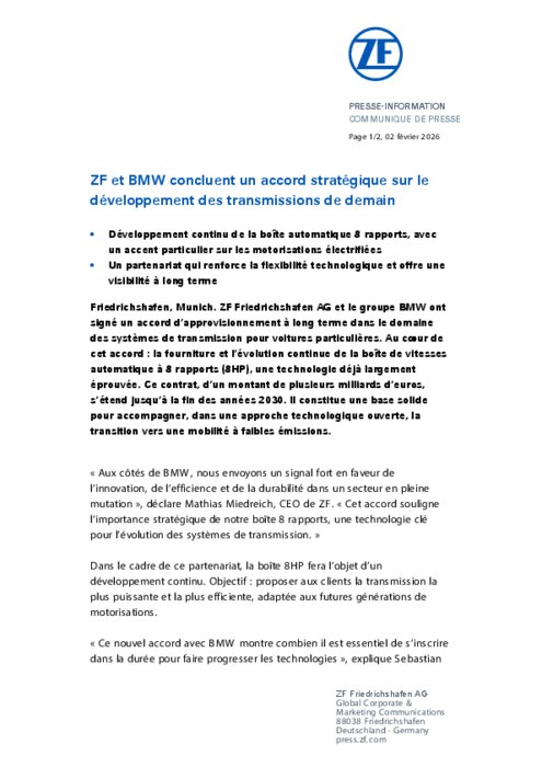 ZF Friedrichshafen AG et le groupe BMW ont signé un accord d’approvisionnement à long terme dans le domaine des systèmes de transmission pour voitures particulières. Au cœur de cet accord : la fourniture et l’évolution continue de la boîte de vitesses automatique à 8 rapports (8HP), une technologie déjà largement éprouvée. Ce contrat, d’un montant de plusieurs milliards d’euros, s’étend jusqu’à la fin des années 2030. Il constitue une base solide pour accompagner, dans une approche technologique ouverte, la transition vers une mobilité à faibles émissions.