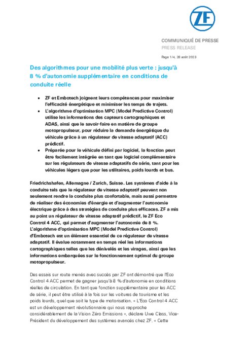 Les systèmes d'aide à la conduite tels que le régulateur de vitesse adaptatif peuvent non seulement rendre la conduite plus confortable, mais aussi permettre de réaliser des économies d'énergie et d'augmenter l'autonomie électrique grâce à des stratégies de conduite plus efficaces. ZF a mis au point un régulateur de vitesse adaptatif prédictif, le ZF Eco Control 4 ACC, qui permet d'augmenter l'autonomie de 8 %. L'algorithme d'optimisation MPC (Model Predictive Control) d'Embotech est un élément essentiel de ce régulateur de vitesse adaptatif.