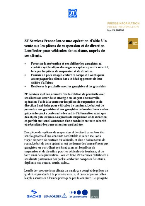 ZF Services met une nouvelle fois la relation de proximité avec ses clients au cœur de sa stratégie en lançant une nouvelle opération d’aide à la vente sur les pièces de suspension et de direction Lemförder pour véhicules de tourisme. Le but est de permettre aux grossistes et aux garagistes de booster leurs ventes grâce à des packs contenants des outils d’information ainsi que des objets publicitaires.