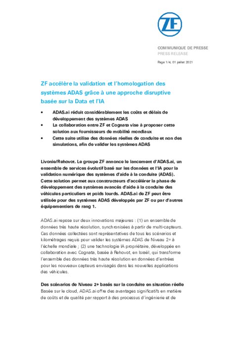 Le groupe ZF annonce le lancement d'ADAS.ai, un ensemble de services évolutif basé sur les données et l'IA pour la validation numérique des systèmes d'aide à la conduite (ADAS). Cette solution permet aux constructeurs d'accélérer la phase de développement des systèmes avancés d'aide à la conduite des véhicules particuliers et poids lourds. ADAS.ai de ZF peut être utilisée pour des systèmes ADAS développés par ZF ou par d'autres équipementiers de rang 1.