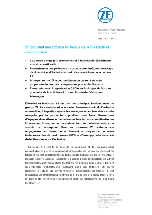 Diversité et Inclusion, tel est l'un des principes fondamentaux du groupe ZF. La transformation actuelle observée au sein de l'industrie automobile, à laquelle s'ajoute les enseignements tirés d'une année marquée par la pandémie, rappellent avec force l'importance d'équipes diversifiées et inclusives et leur impact considérable sur l'innovation à long terme, la satisfaction des collaborateurs et le succès de l'entreprise. Dans ce contexte, ZF renforce son engagement en faveur de la diversité...