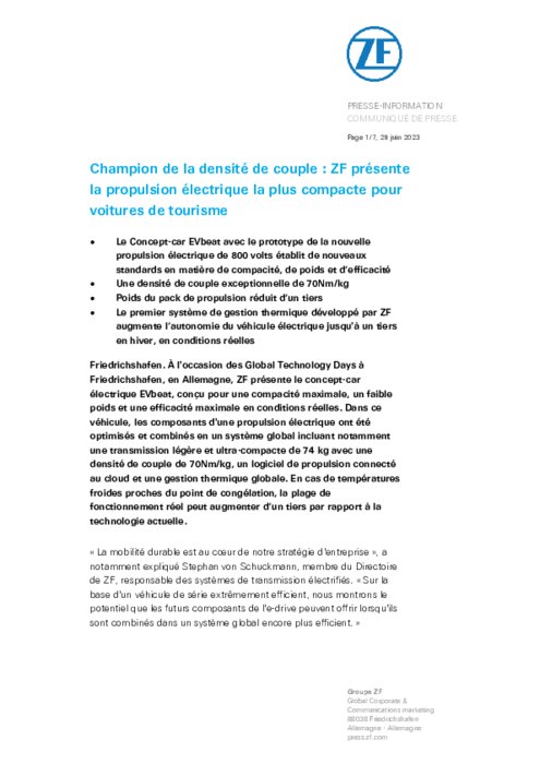 À l'occasion des Global Technology Days à Friedrichshafen, en Allemagne, ZF présente le concept-car électrique EVbeat, conçu pour une compacité maximale, un faible poids et une efficacité maximale en conditions réelles. Dans ce véhicule, les composants d'une propulsion électrique ont été optimisés et combinés en un système global incluant notamment une transmission légère et ultra-compacte de 74 kg avec une densité de couple de 70Nm/kg un logiciel de propulsion connecté au cloud.