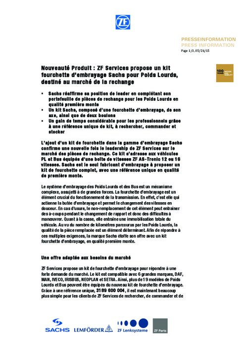 L'ajout d'un kit de fourchette dans la gamme d'embrayage Sachs confirme une nouvelle fois le leadership de ZF sur le marché des pièces de rechange. Ce kit s'adresse aux véhicules PL et Bus équipés d'une boite de vitesses ZF AS-Tronio 12 ou 16 vitesses. Sachs est le seul fabriquant à proposer un kit de fourchette complet, avec une référence unique en qualité de première monte.