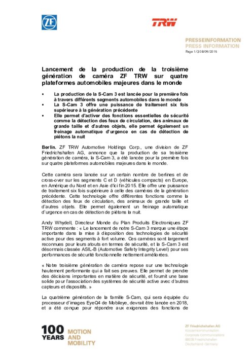 ZF TRW annonce que la production de sa troisième génération de caméra, la S-Cam 3, a été lancée pour la première fois sur quatre plateformes automobiles majeures dans le monde. Cette caméra sera lancée sur un certain nombre de berlines et de cross-over sur les segments C et D (véhicules compacts) en Europe, en Amérique du Nord et en Asie d'ici fin 2015. Elle offre une puissance de traitement six fois supérieure à celle des caméras de la génération précédente.