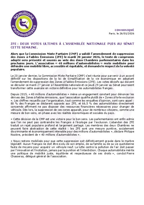 Le 20 janvier dernier, la Commission Mixte Paritaire (CMP) s’est réunie pour parvenir à un accord définitif sur les dispositions de la loi de Simplification de la vie économique en adoptant l’amendement de suppression des Zones à Faibles Émissions (ZFE). Les votes décisifs qui doivent se dérouler ce mardi 27 janvier à l’Assemblée nationale et ce jeudi 29 janvier au Sénat pourraient transformer cette avancée en victoire définitive pour les automobilistes français.