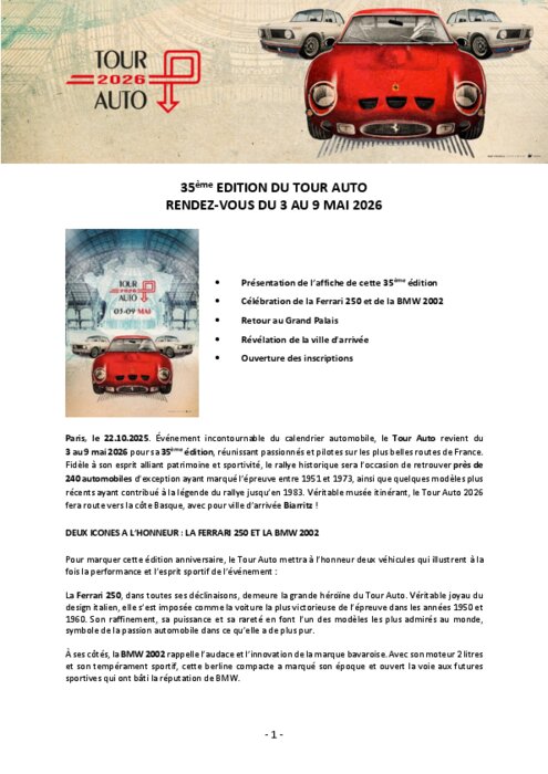 Événement incontournable du calendrier automobile, le Tour Auto revient du 3 au 9 mai 2026 pour sa 35ème édition, réunissant passionnés et pilotes sur les plus belles routes de France. Fidèle à son esprit alliant patrimoine et sportivité, le rallye historique sera l’occasion de retrouver près de 250 automobiles d’exception ayant marqué l’épreuve entre 1951 et 1973, ainsi que quelques modèles plus récents ayant contribué à la légende du rallye jusqu’en 1983. Véritable musée itinérant, le Tour Auto 2026 fera route vers la côte Basque, avec pour ville d’arrivée Biarritz !