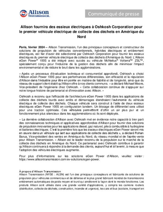 Allison Transmission, l'un des principaux concepteurs et constructeur de solutions de propulsion de véhicules conventionnels, hybrides électriques et entièrement électriques, est fier d'avoir été sélectionné par Oshkosh Corporation pour fournir les essieux électriques du premier véhicule électrique de collecte des déchets d'Amérique du Nord.
