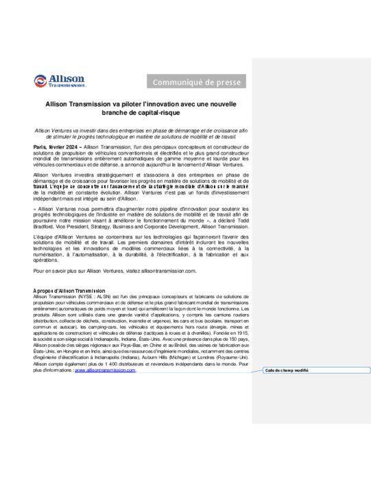 Allison Transmission, l'un des principaux concepteurs et constructeur de solutions de propulsion de véhicules conventionnels et électrifiés et le plus grand constructeur mondial de transmissions entièrement automatiques de gamme moyenne et lourde pour les véhicules commerciaux et de défense, a annoncé aujourd'hui le lancement d'Allison Ventures.