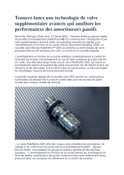 Tenneco étoffe sa gamme leader de produits d’amortissement passif Monroe OE Solutions avec l’introduction d’une valve supplémentaire avancée dotée d’excellentes capacités de réglage pour l’amortissement en fonction de la course (Stroke Dependent Damping, SDD). La nouvelle valve Monroe RideRefine SDD se combine aux technologies de valve principale Monroe OE Solutions pour offrir un confort et un contrôle inégalés.