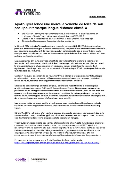 Apollo Tyres a lancé une nouvelle variante 385/55 R22.5 de son célèbre pneu pour remorque longue distance EnduMile LHT, son produit pour remorque de camion le plus économe en carburant. Le nouveau produit est disponible dès à présent dans toute l'Europe, en complément du premier EnduMile LHT qui a été lancé en format 385/65 R22.5 en octobre de l'année dernière.