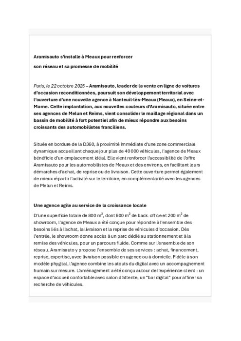 Aramisauto, leader de la vente en ligne de voitures d’occasion reconditionnées, poursuit son développement territorial avec l’ouverture d’une nouvelle agence à Nanteuil-lès-Meaux (Meaux), en Seine-et-Marne. Cette implantation, aux nouvelles couleurs d’Aramisauto, située entre ses agences de Melun et Reims, vient consolider le maillage régional dans un bassin de mobilité à fort potentiel afin de mieux répondre aux besoins croissants des automobilistes franciliens.