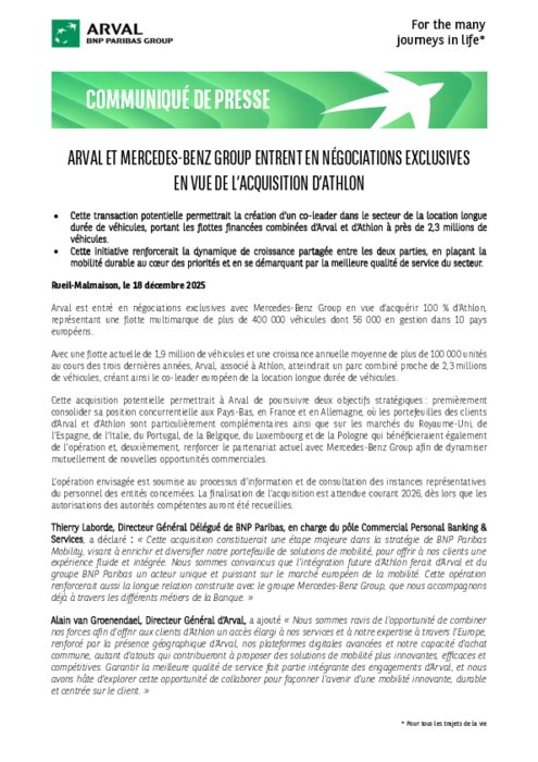 Arval et Mercedes-Benz Group en négociations exclusives en vue de l'acquisition d'Athlon