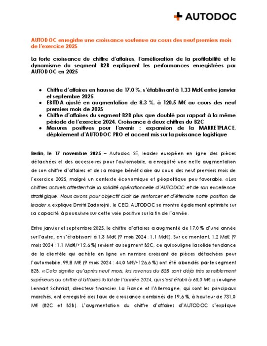 Autodoc SE, leader européen en ligne des pièces détachées et des accessoires pour l’automobile, a enregistré une nette augmentation de son chiffre d’affaires et de sa marge bénéficiaire au cours des neuf premiers mois de l’exercice 2025, malgré un contexte économique et géopolitique peu favorable. « Les chiffres actuels attestent de la solidité opérationnelle d'Autodoc et de son excellence stratégique. Nous avons pour objectif clair de renforcer et d’étendre notre position de leader », explique Dmitri Zadorojnii, le CEO. Autodoc se montre également optimiste sur sa capacité à poursuivre sur cette voie positive sur la fin de l’année.