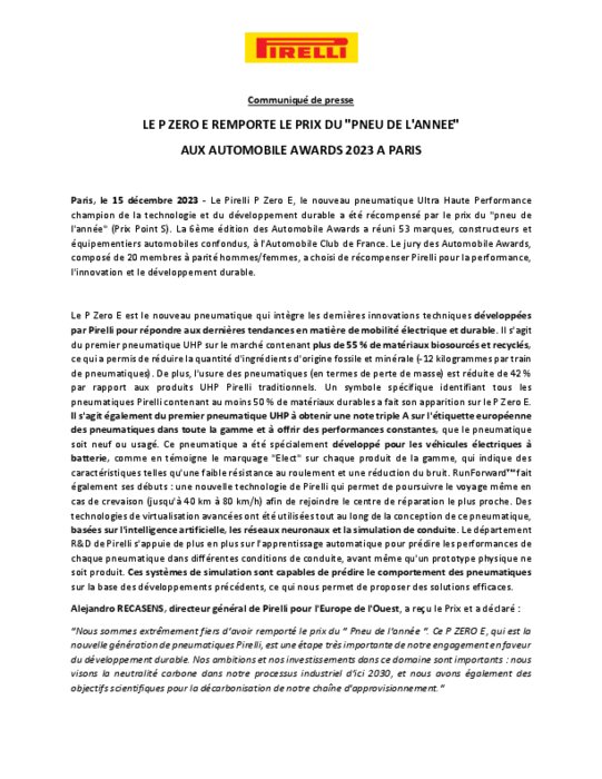 Le Pirelli P Zero E, le nouveau pneumatique Ultra Haute Performance champion de la technologie et du développement durable a été récompensé par le prix du "pneu de l'année" (Prix Point S). La 6ème édition des Automobile Awards a réuni 53 marques, constructeurs et équipementiers automobiles confondus, à l'Automobile Club de France.