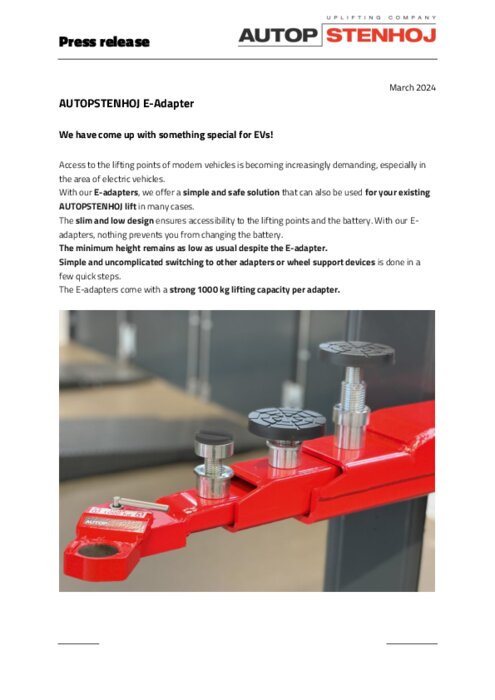 Equipementiers 15 mars 2024 - 10:18 Le passage simple et simple à d'autres adaptateurs ou dispositifs de support de roue s'effectue de manière simple et rapide. Les E-Adapter ont une forte capacité de levage de 1 000 kg par adaptateur. PDF (534 Ko) Télécharger