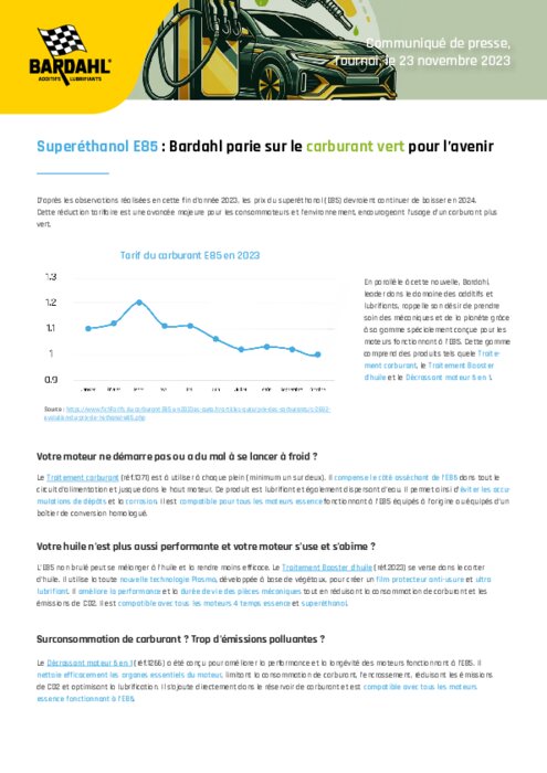 Bardahl, leader dans le domaine des additifs et lubrifiants, rappelle son désir de prendre soin des mécaniques et de la planète grâce à sa gamme spécialement conçue pour les moteurs fonctionnant à l’E85. Cette gamme comprend des produits tels que le Traitement carburant, le Traitement Booster d’huile et le Décrassant moteur 5 en 1.