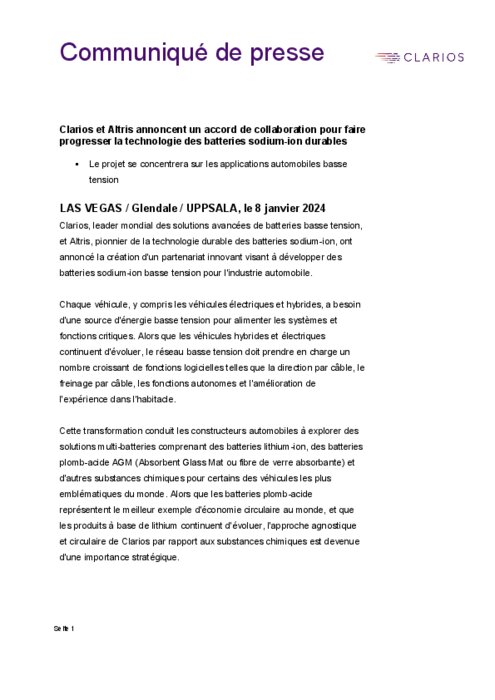 Clarios, leader mondial des solutions avancées de batteries basse tension, et Altris, pionnier de la technologie durable des batteries sodium-ion, ont annoncé la création d'un partenariat innovant visant à développer des batteries sodium-ion basse tension pour l'industrie automobile.