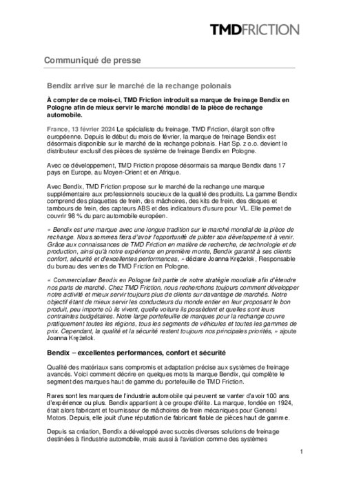En février, le spécialiste du freinage, TMD Friction élargit son offre européenne avec l'annonce du lancement de sa marque de freinage Bendix en Pologne. Son objectif : toujours mieux servir le marché mondial de la pièce de rechange automobile en étant présent avec sa marque Bendix dans désormais 17 pays en Europe, au Moyen-Orient et en Afrique.