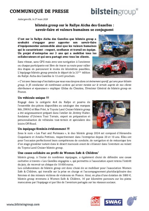 C’est sur le Rallye Aïcha des Gazelles que Bilstein Group a souhaité s’engager pour apporter son savoir-faire d’équipementier automobile ainsi que les valeurs humaines qui le caractérisent : respect, confiance et travail en équipe. Un projet d’entreprise sur 3 ans qui a mobilisé tous les collaborateurs et qui sera partagé avec tous les clients.