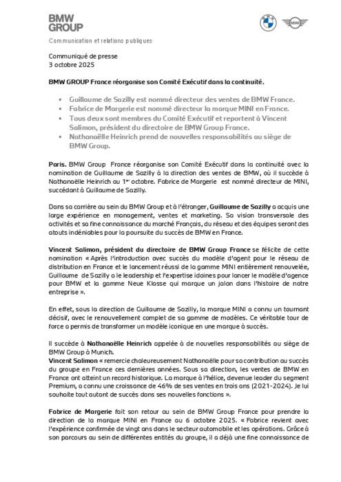 BMW Group France annonce plusieurs nominations : Guillaume de Sazilly devient directeur des ventes de BMW France et Fabrice de Margerie prend la direction de MINI en France. Tous deux rejoignent le Comité Exécutif sous la responsabilité de Vincent Salimon, président du directoire. Parallèlement, Nathanaëlle Heinrich se voit confier de nouvelles fonctions au siège du groupe.