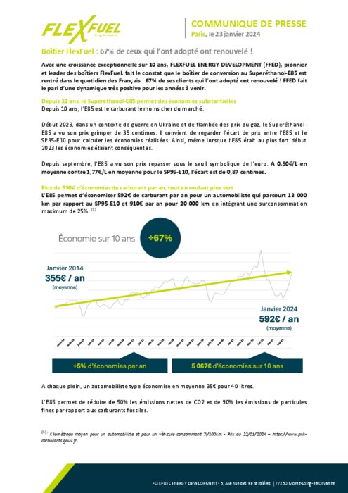 Equipementiers 23 janvier 2024 - 12:03 Avec une croissance exceptionnelle sur 10 ans, FLEXFUEL ENERGY DEVELOPMENT (FFED), pionnier et leader des boîtiers FlexFuel, fait le constat que le boîtier de conversion au Superéthanol-E85 est rentré dans le quotidien des Français. PDF (314 Ko) Télécharger