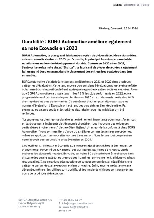 BORG Automotive, le plus grand fabricant européen de pièces détachées automobiles, a de nouveau été évalué en 2023 par Ecovadis, le principal fournisseur mondial de notations en matière de développement durable. Comme en 2022 et en 2021, l'entreprise a obtenu le statut "Bronze". Le fabricant de pièces détachées a également fait un grand bond en avant dans le classement des entreprises évaluées dans leur ensemble.