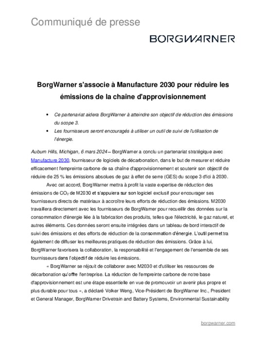 BorgWarner a conclu un partenariat stratégique avec Manufacture 2030, fournisseur de logiciels de décarbonation, dans le but de mesurer et réduire efficacement l'empreinte carbone de sa chaîne d'approvisionnement et soutenir son objectif de réduire de 25 % les émissions absolues de gaz à effet de serre (GES) du scope 3 d'ici à 2030.