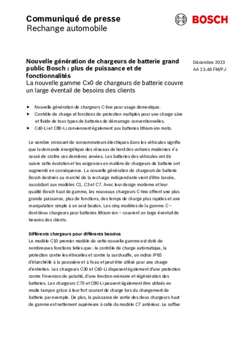 La nouvelle génération de chargeurs de batterie Bosch destinés au marché de la recharge indépendante vient d'être lancée, succédant aux modèles C1, C3 et C7. Avec leur design moderne et leur qualité Bosch haut de gamme, les nouveaux chargeurs C-line offrent une plus grande puissance, plus de fonctions, des temps de charge plus rapides et une manipulation simple à un seul bouton.
