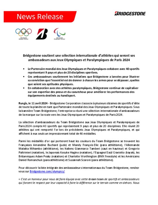 Bridgestone Corporation s’associe à plusieurs dizaines de sportifs d’élite de toute la planète en tant que Partenaire mondial des Jeux Olympiques et Paralympiques. Sous la bannière Team Bridgestone, l’entreprise a réuni une sélection internationale d’ambassadeurs de la marque sur la route vers les Jeux Olympiques et Paralympiques de Paris 2024.