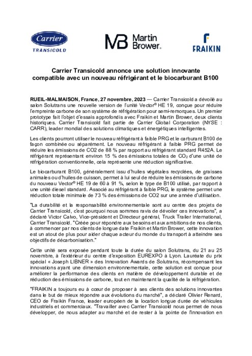 Carrier Transicold a dévoilé au salon Solutrans une nouvelle version de l’unité Vector HE 19, conçue pour réduire l’empreinte carbone de son système de réfrigération pour semi-remorques. Un premier prototype fait l'objet d'essais approfondis avec Fraikin et Martin Brower, deux clients historiques. Carrier Transicold fait partie de Carrier Global Corporation, leader mondial des solutions climatiques et énergétiques intelligentes.