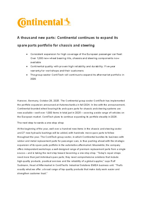 Le groupe Continental ContiTech a mis en œuvre l'élargissement de son portefeuille annoncé lors du salon Automechanika à l'automne 2024. Conformément à cette annonce, des kits de roulements de roue et des pièces de rechange pour châssis et systèmes de direction de marque Continental sont désormais disponibles – plus de 1 000 articles au total pour la seule année 2025 – couvrant une large gamme de véhicules sur le marché européen. ContiTech prévoit de poursuivre l'élargissement de son portefeuille de manière régulière en 2026.