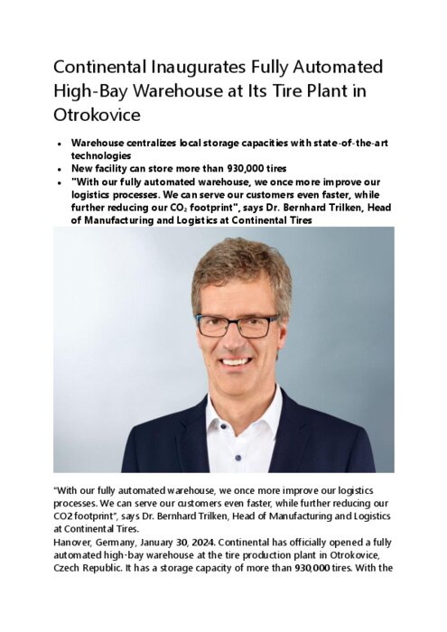 Continental a officiellement inauguré un entrepôt à grande hauteur entièrement automatisé dans l'usine de production de pneus d'Otrokovice, en République tchèque. Elle dispose d’une capacité de stockage de plus de 930 000 pneus. Avec cette installation, le fabricant de pneus haut de gamme centralise ses entrepôts dans la région d'Otrokovice. En conséquence, les processus logistiques de Continental pourraient être encore optimisés tout en réduisant les émissions de CO2 de ses opérations.