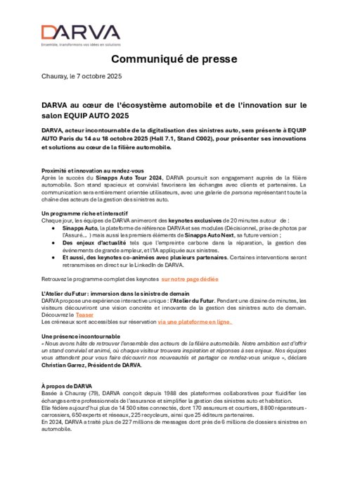 Services 07 octobre 2025 - 11:52 DARVA, acteur incontournable de la digitalisation des sinistres auto, sera présente à EQUIP AUTO Paris du 14 au 18 octobre (Hall 7.1, Stand C002), pour présenter ses innovations et solutions au cœur de la filière automobile. PDF (4 Mo) Télécharger © Darva