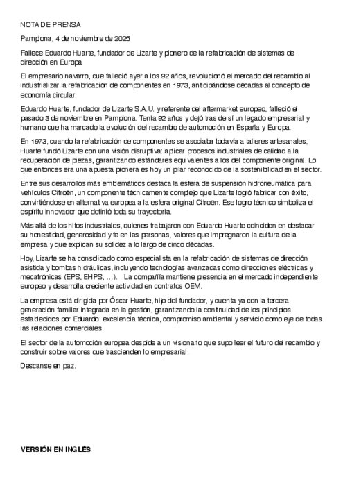 Eduardo Huarte, fondateur de Lizarte S.A.U. et référence de l'aftermarket européen, est décédé le 3 novembre à Pampelune. Il avait 92 ans et laisse derrière lui un héritage entrepreneurial et humain qui a marqué l'évolution de la rechange automobile en Espagne et en Europe.