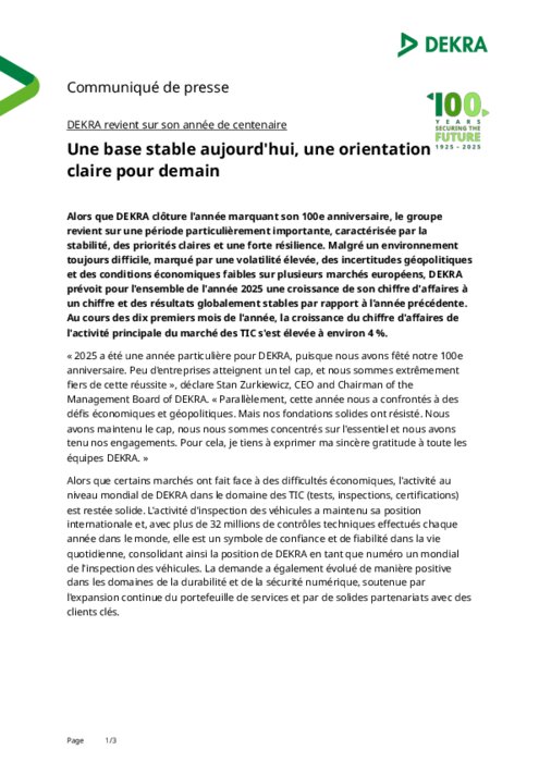 Alors que DEKRA clôture l'année marquant son 100e anniversaire, le groupe revient sur une période particulièrement importante, caractérisée par la stabilité, des priorités claires et une forte résilience. Malgré un environnement toujours difficile, marqué par une volatilité élevée, des incertitudes géopolitiques et des conditions économiques faibles sur plusieurs marchés européens, DEKRA prévoit pour l'ensemble de l'année 2025 une croissance de son chiffre d'affaires à un chiffre et des résultats globalement stables par rapport à l'année précédente. Au cours des dix premiers mois de l'année, la croissance du chiffre d'affaires de l'activité principale du marché des TIC s'est élevée à environ 4 %.