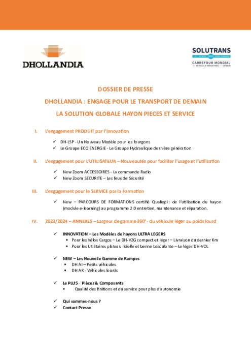 A l’occasion de Solutrans, Dhollandia concepteur, fabricant et distributeur de hayon élévateur depuis plus de 50 ans s’est engagé pour le Transport de Demain en présentant sa Solution globale Hayon Pièces et services intégrant innovations et évolutions dédiées aux hayons élévateurs ainsi qu’une toute nouvelle gamme de rampes pour tous types de véhicules.