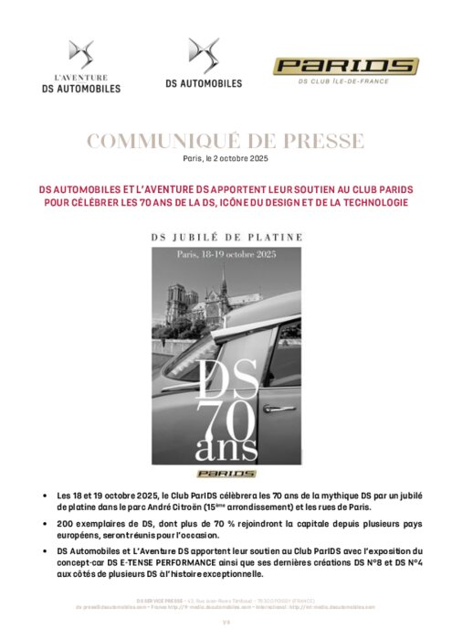 de platine dans le parc André Citroën (15ème arrondissement) et les rues de Paris. 200 exemplaires de DS, dont plus de 70 % rejoindront la capitale depuis plusieurs pays européens, seront réunis pour l’occasion. DS Automobiles et L’Aventure DS apportent leur soutien au Club ParIDS avec l’exposition du concept-car DS E-Tense Performance ainsi que ses dernières créations DS N°8 et DS N°4 aux côtés de plusieurs DS à l’histoire exceptionnelle.