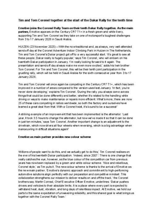 Emotive rejoint le Coronel Rally Team pour leur dixième Rallye Dakar ensemble. En tant que partenaire principal,