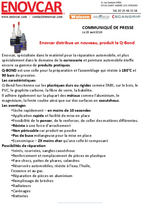 Enovcar, spécialisée dans le matériel pour la réparation automobile, et plus spécialement dans le domaine de la carrosserie et peinture automobile étoffe encore sa gamme de produits pratiques. Q-BOND est une colle pour la préparation et l’assemblage qui résiste à 180°C et 90 bars de pression.